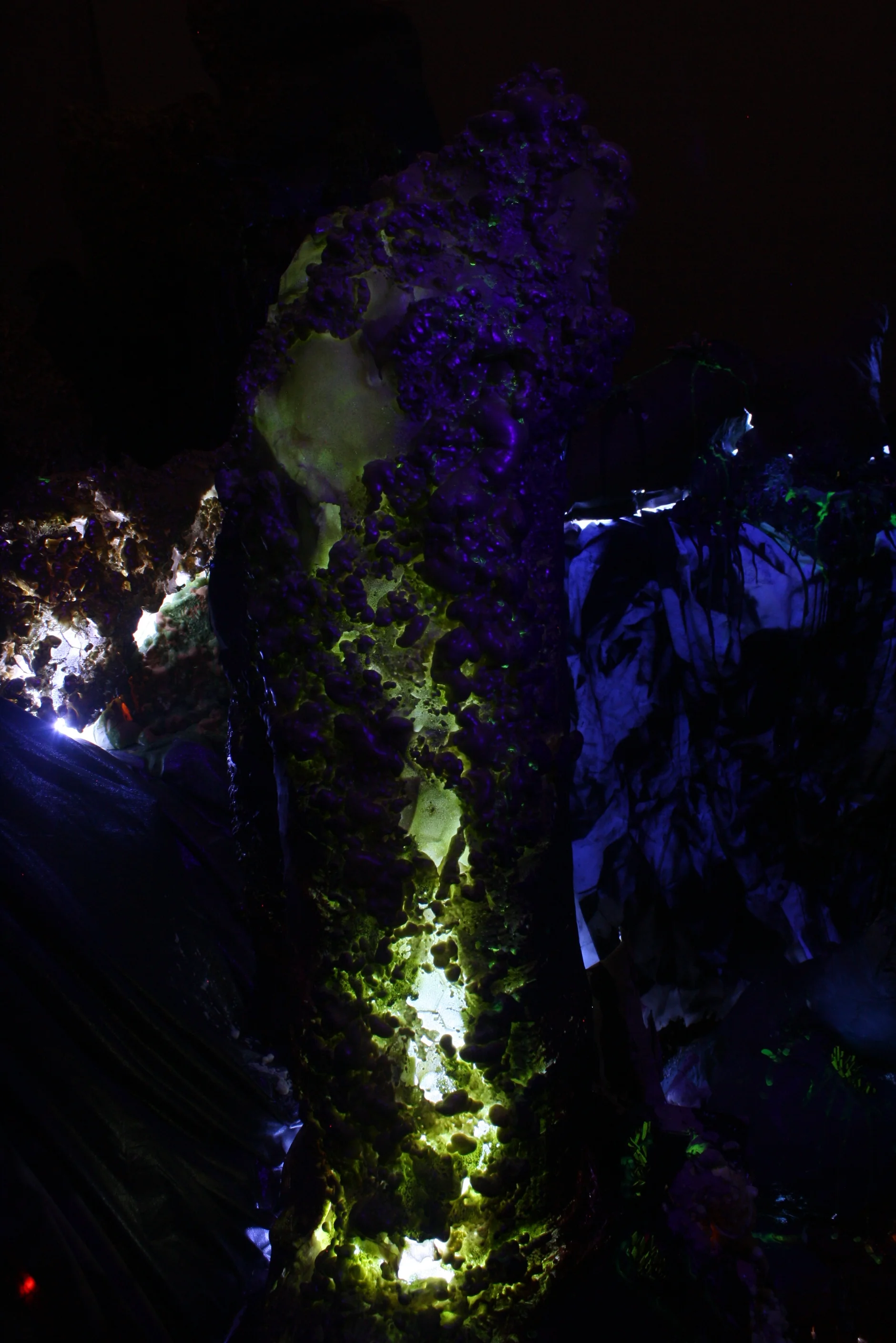 gelatin windows, glue bindings, stucco patch mountains, paper clay made from mushrooms, paper machéd research, latex paint skins, fabric shadows, insulation foam encrustations, leather crystals, wheat paste lichen, glow in the dark paint drips, video projection of loopy temporality, wooden armature bones, chicken wire muscles, PIR sensor guides, blue led as kobolds, black/ sheer curtain passageways, spray paint droppings, silver mylar pools and gravity, time, experience, shadows